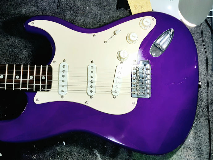 Set up on this Fender Stratocaster. Adjustments were made to the string height, intonation, truss rod and tremolo