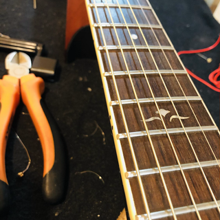 The treble side was a lot higher than the bass side so I’ve sanded down on the saddle to straighten it out again. Adjustments were made on the nut and i put on a fresh set of ErnieBall Earthwood strings.